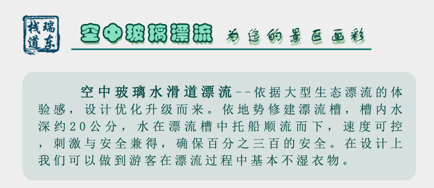我公司為國內首條玻璃滑道設計施工單位,擁有十余年經驗,專業設計承建、投資運營景區花崗巖滑道、玻璃滑道、水滑道漂流、大型生態漂流、玻璃吊橋、棧道等項目。聯系電話:18032092866(微信號同電話)