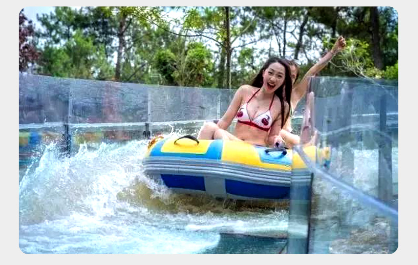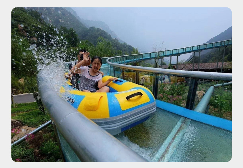 一是,依據大型生態漂流的體驗感,設計優化升級而來。依地勢修建漂流槽,槽內水深約20公分,水在漂流槽中托船順流而下,速度可控,刺激與安全兼得,確保百分之三百的安全。在設計上我們可以做到游客在漂流過程中基本不濕衣物。我們暫且稱這種形式的漂流為水滑道漂流